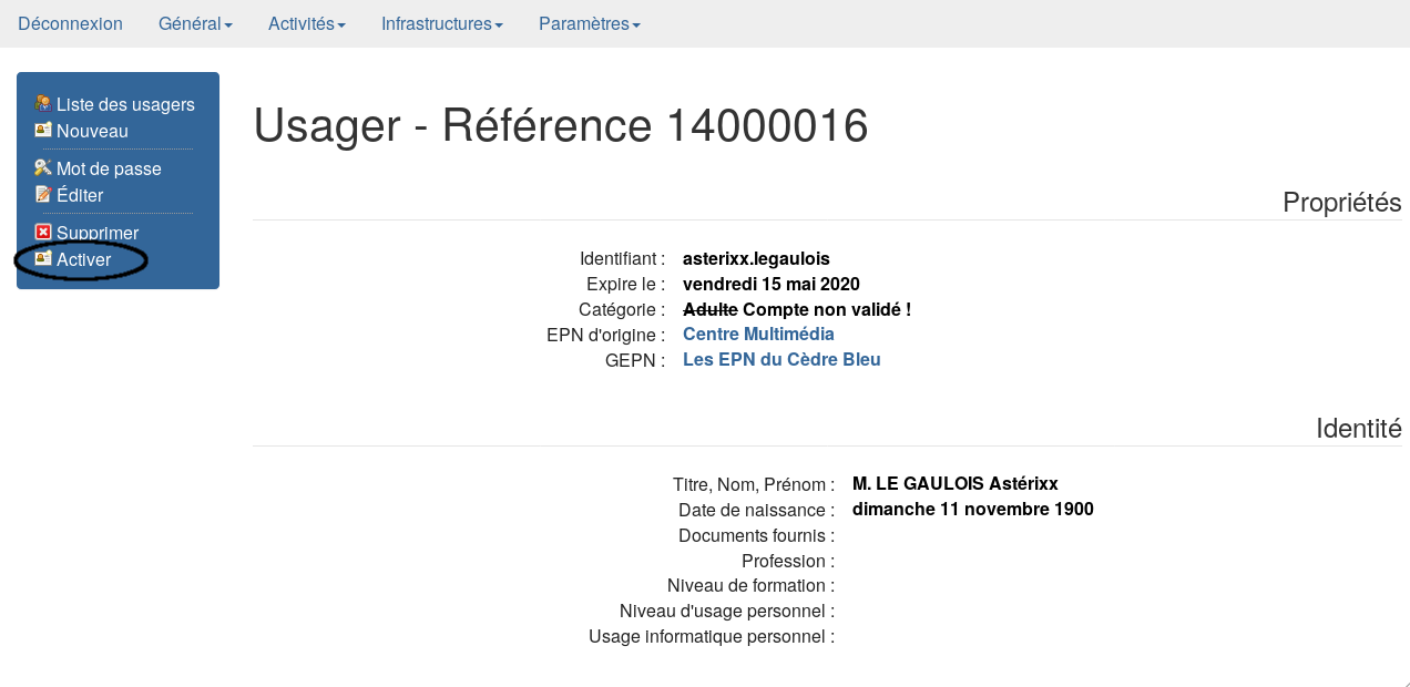 Pour valider l’inscription d’un usager ayant lui-même rempli son formulaire d’inscription, allez dans la liste des usagers, cliquez sur l’usager, puis sur « Activer » dans le menu de gauche.