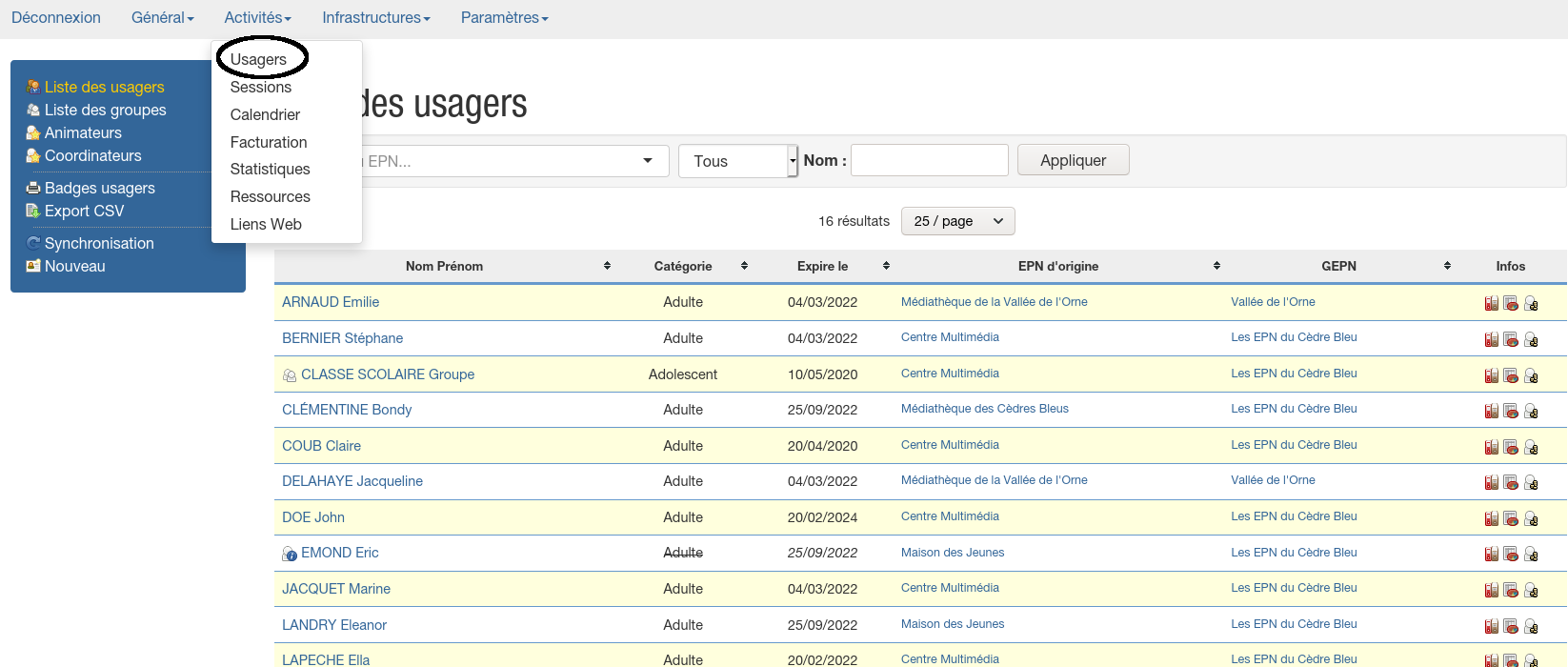 Vous pouvez accéder à la liste des usagers en cliquant sur l’onglet Activités → Usagers.