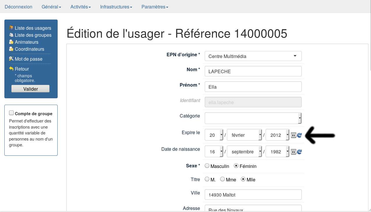 Par défaut, l’adhésion d’un usager est valable 1 an, mais le choix de la période d’expiration reste entièrement libre, et est modifiable lors de la création d’un nouvel usager.