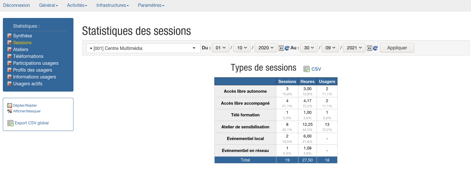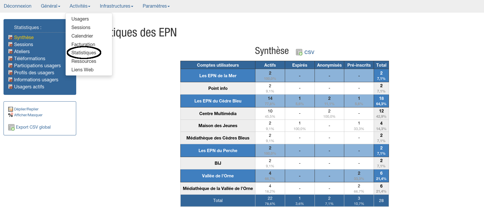 Nous pouvons accéder aux statistiques de chacun des EPN de la plateforme, via l’onglet Activités → Statistiques.