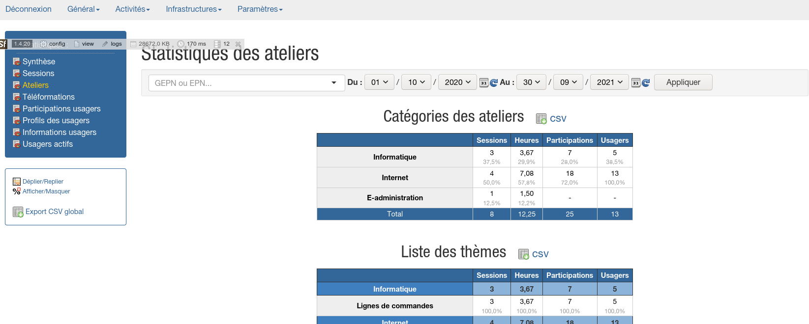 Dans l’exemple ci-dessous, on peut voir que 3 usagers ont pu participer à l’atelier « Lignes de commandes », classé dans la catégorie « Informatique » :