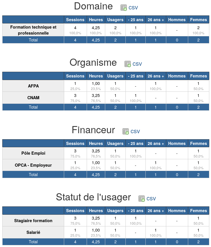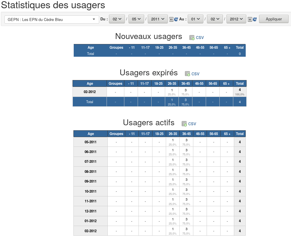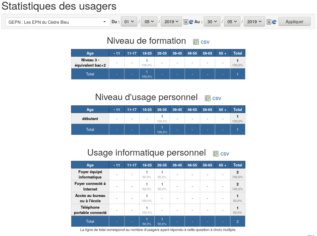 Les statistiques de participation des usagers sont générées au sein de tableurs, téléchargeables en .csv.
