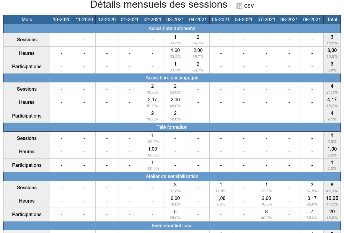 Les sessions sont divisées par type (Accès libre autonome, Accès libre accompagné, Atelier de sensibilisation, Evénementiel local), dans lesquels sont calculés :
