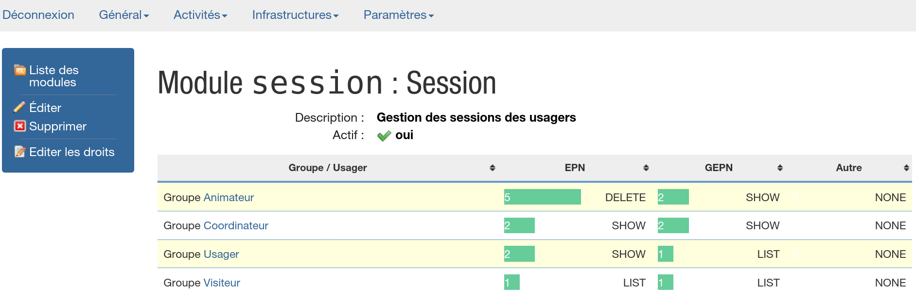 un animateur a tous les droits concernant la gestion d’une session sur son (ses) EPN (DELETE) mais ne possède que le droit de voir la fiche d’une session sur les autres EPN (SHOW)