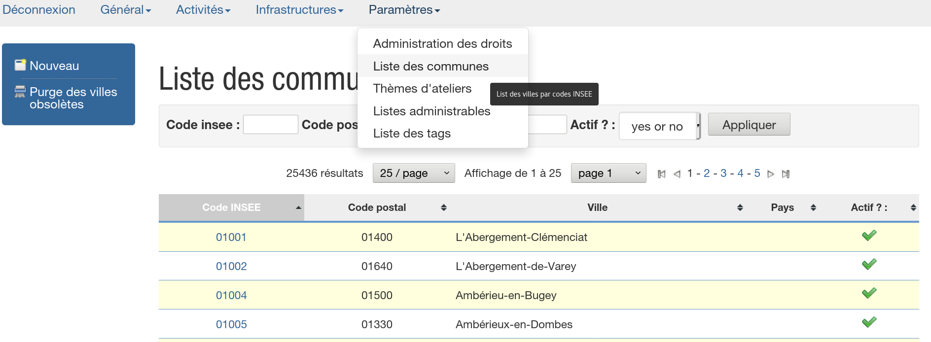 La liste des communes est disponible en cliquant sur Paramètres → Liste des communes