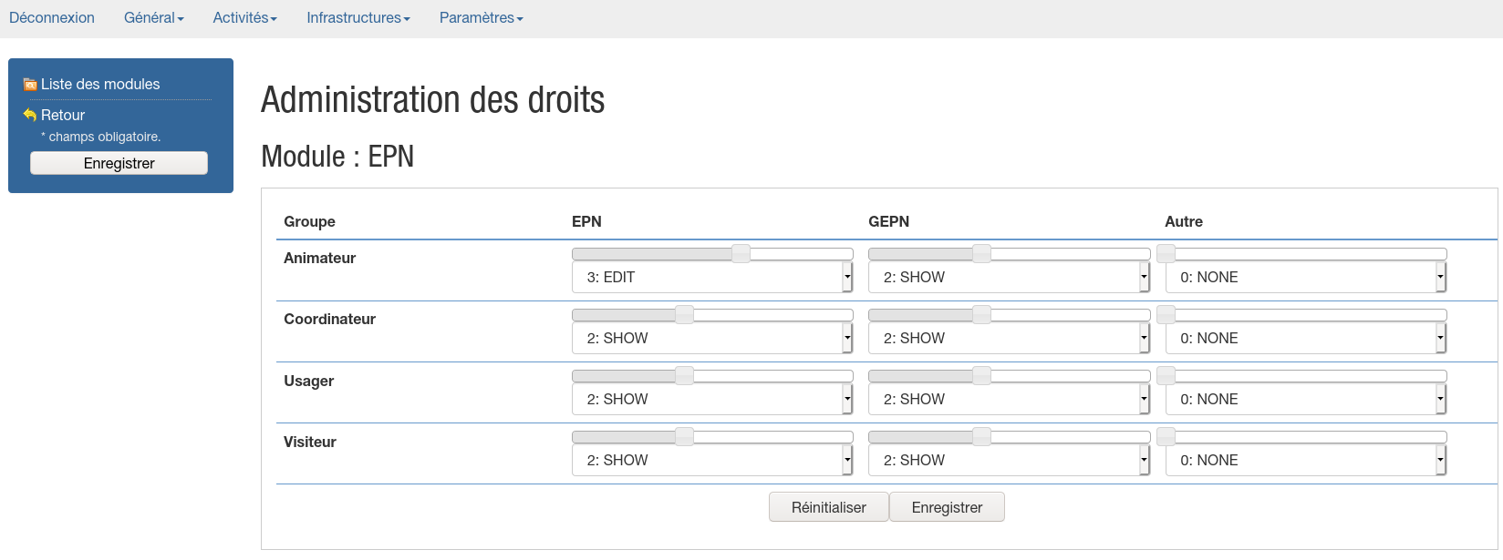 Dans ce cas, dans la liste, cliquer sur « EPN », puis « Editer les droits », et modifier la force des droits en fonction de nos besoins (en l’occurence, dans EPN/Animateur, mettre la force 4), puis enregistrer.