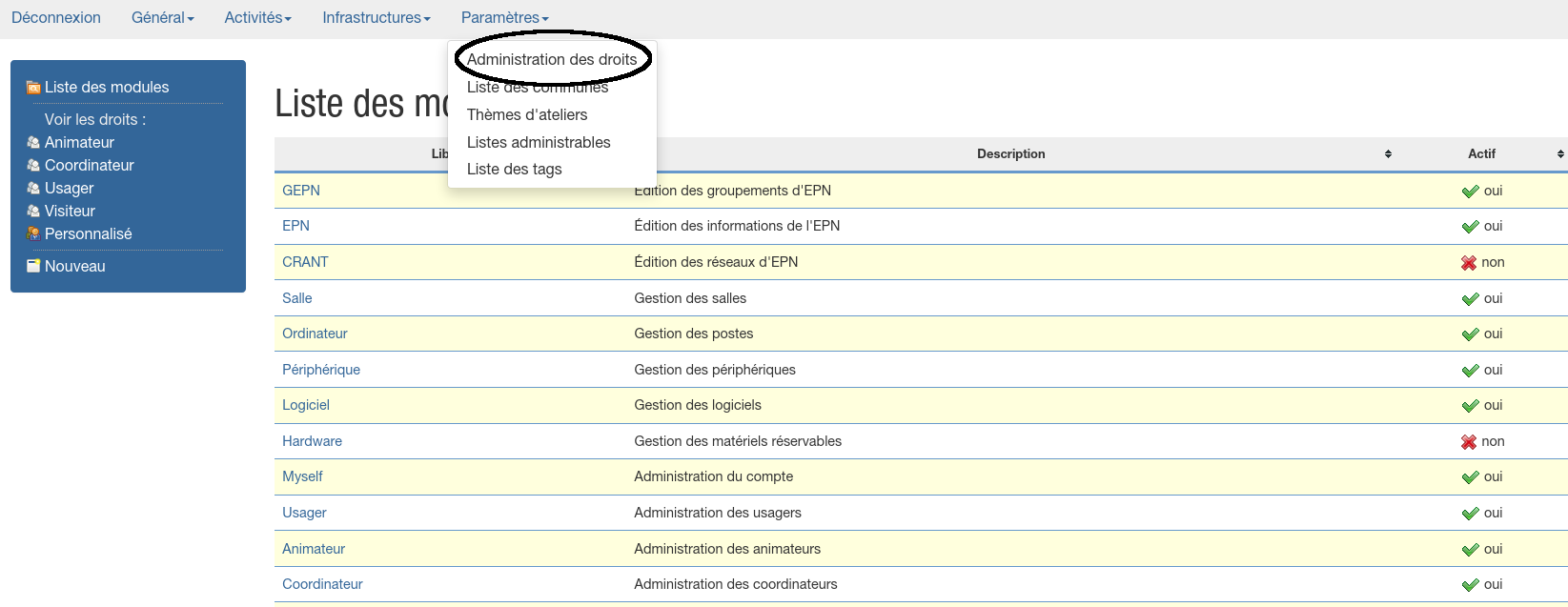 Admettons que nous souhaitions donner le droit aux animateurs de créer un nouvel EPN.