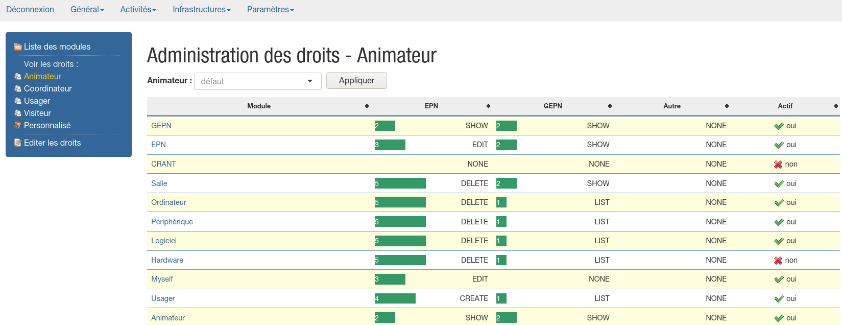 En tant qu’administrateur, nous pouvons administrer les droits de chaque type d’utilisateur de l’application ProxyEPN (du simple visiteur à l’animateur, en passant par le coordinateur).