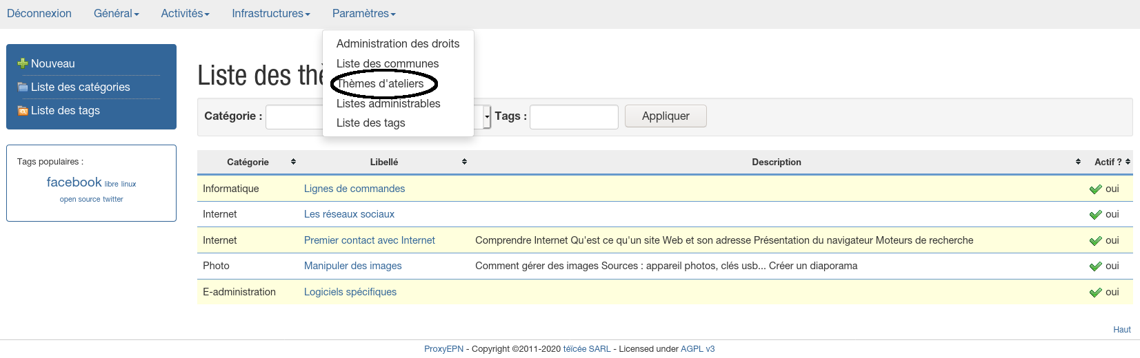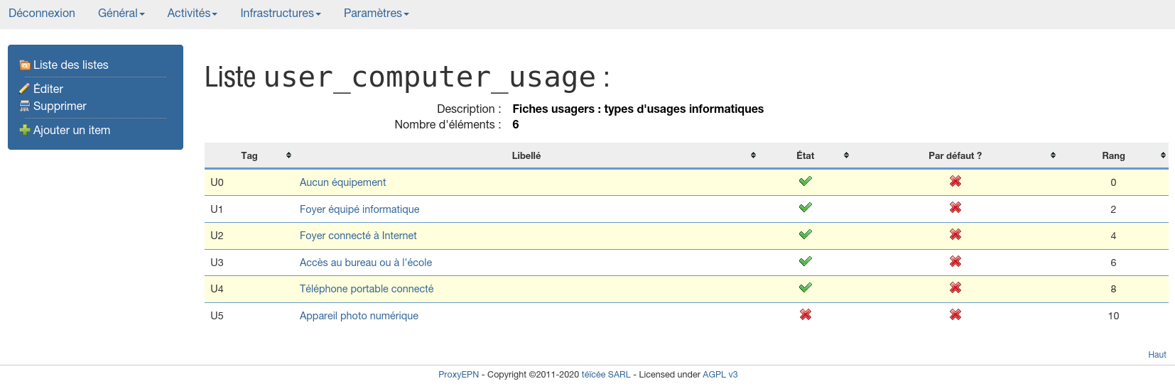 Un clic sur l’une de ces listes permet d’accéder à l’ensemble de ses libellés. Par exemple, l’image ci-dessous reprend la liste des libellés disponibles pour les types d’usages informatiques des fiches usagers.