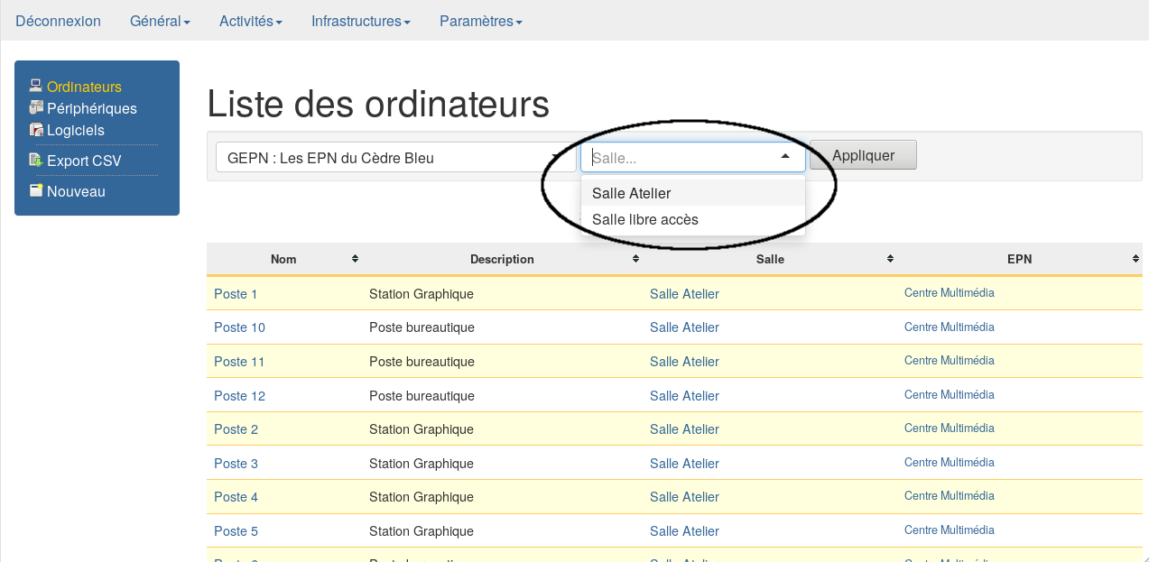 Dans le cas où l’EPN possède plusieurs salles, il est possible d’effectuer un filtre par nom de salle.