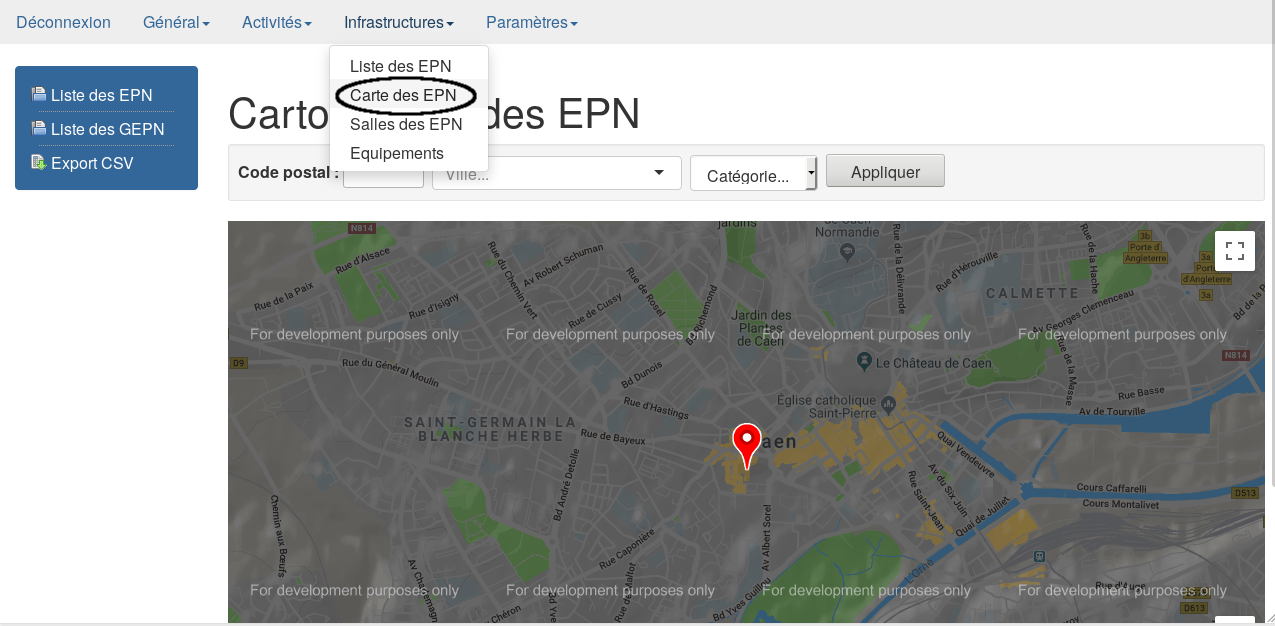 La carte interactive est accessible via l’onglet infrastructures → carte des EPN.
