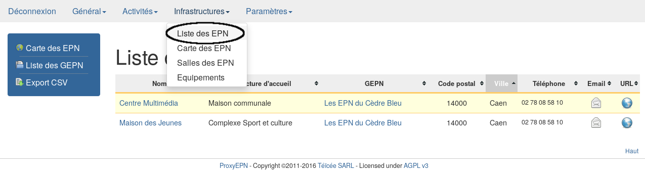 La liste complète des EPN est disponible via l’onglet Infrastructures → Liste des EPN.