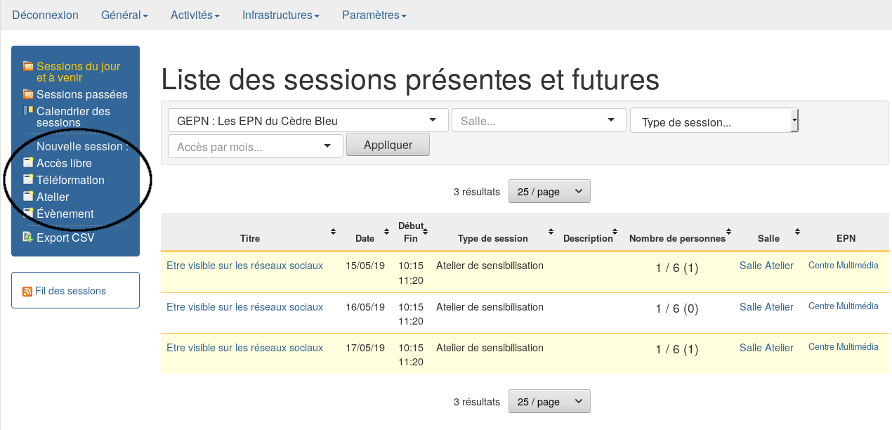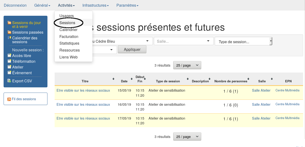 L’animateur peut gérer les activités de son EPN via l’onglet Activités → Sessions.