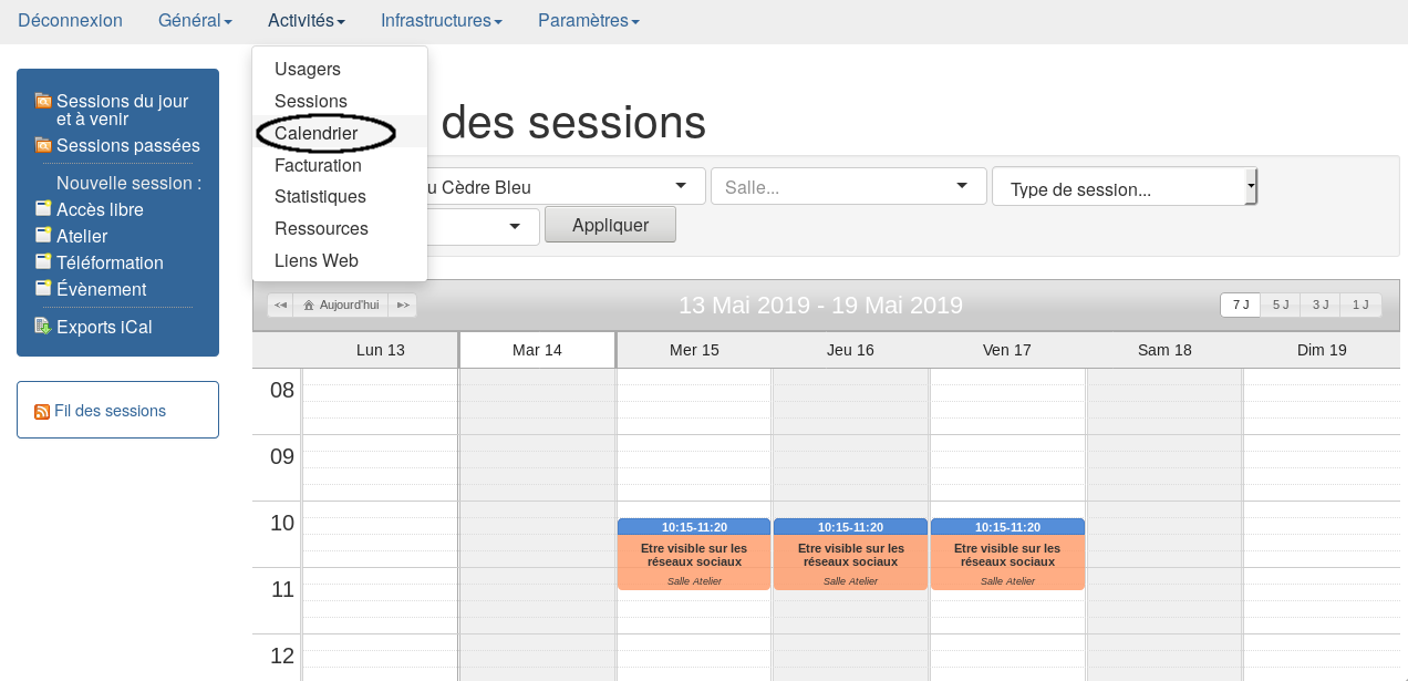 L’accès à la liste des ateliers se fait via l’onglet Activités → Sessions, puis en sélectionnant « Sessions du jour et à venir » ou « Sessions passées » dans le menu de gauche.