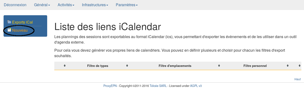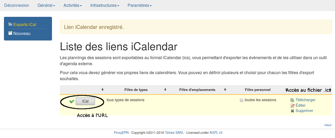 Vous pouvez effectuer un export du calendrier des activités vers votre propre agenda en ligne, en cliquant sur le lien « Exports iCal » dans le menu de gauche.