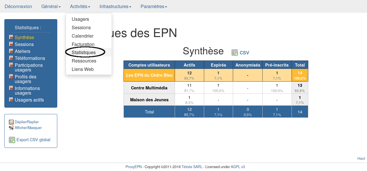 ProxyEPN permet la génération de diverses statistiques (relatives aux sessions, ateliers, usagers, …) exportables en tableur .csv