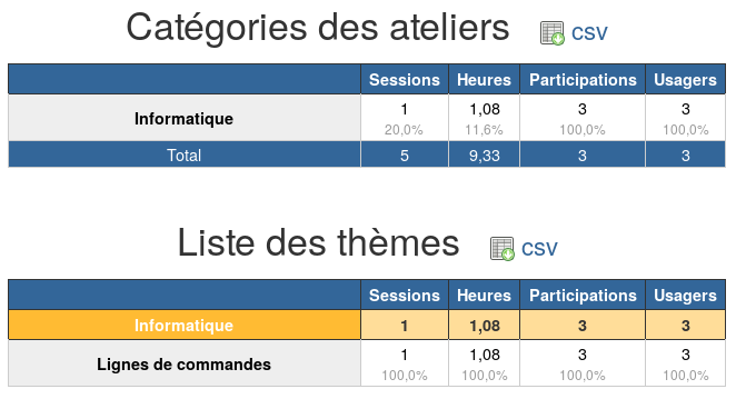Dans l’exemple ci-dessous, on peut voir que 3 usagers ont pu participer à l’atelier « Lignes de commandes », classé dans la catégorie « Informatique » :