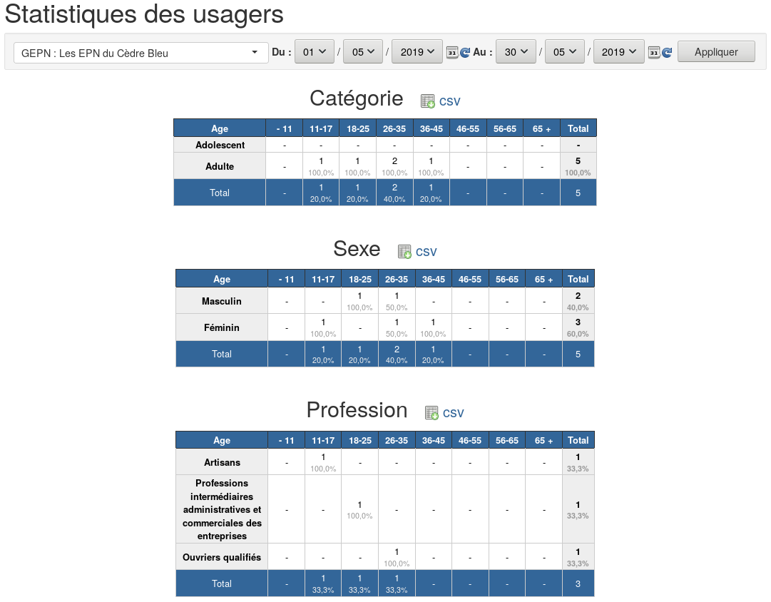 Cette page génère des statistiques liées aux usagers de l’EPN. Vous pouvez la filter par nom d’EPN et par date afin d’obtenir des informations sur l’âge des usagers, leur catégorie (adulte, adolescent, …), leur sexe et leur profession (si renseignée dans la fiche usager).