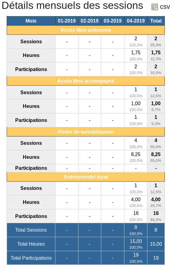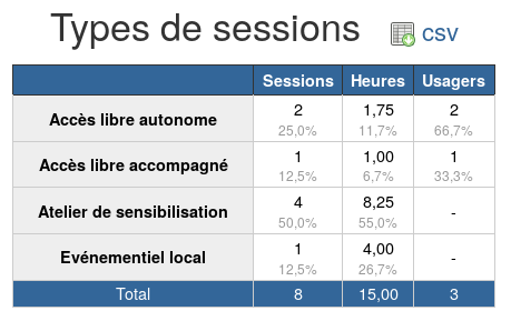 Ces sessions sont divisées par type de session (Accès libre autonome, Accès libre accompagné, Atelier de sensibilisation, Evénementiel local), dans lesquels sont calculés :