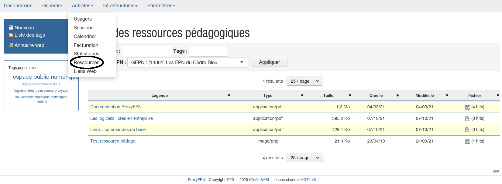 La recherche d’une ressource pédagogique peut se faire via une liste, disponible dans l’onglet Activités → Ressources.