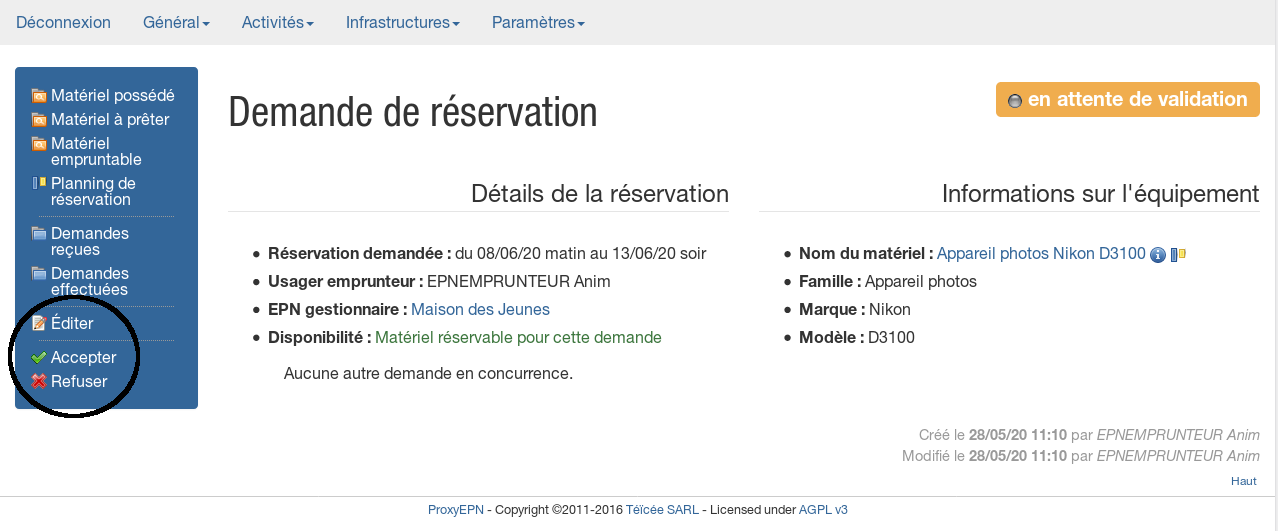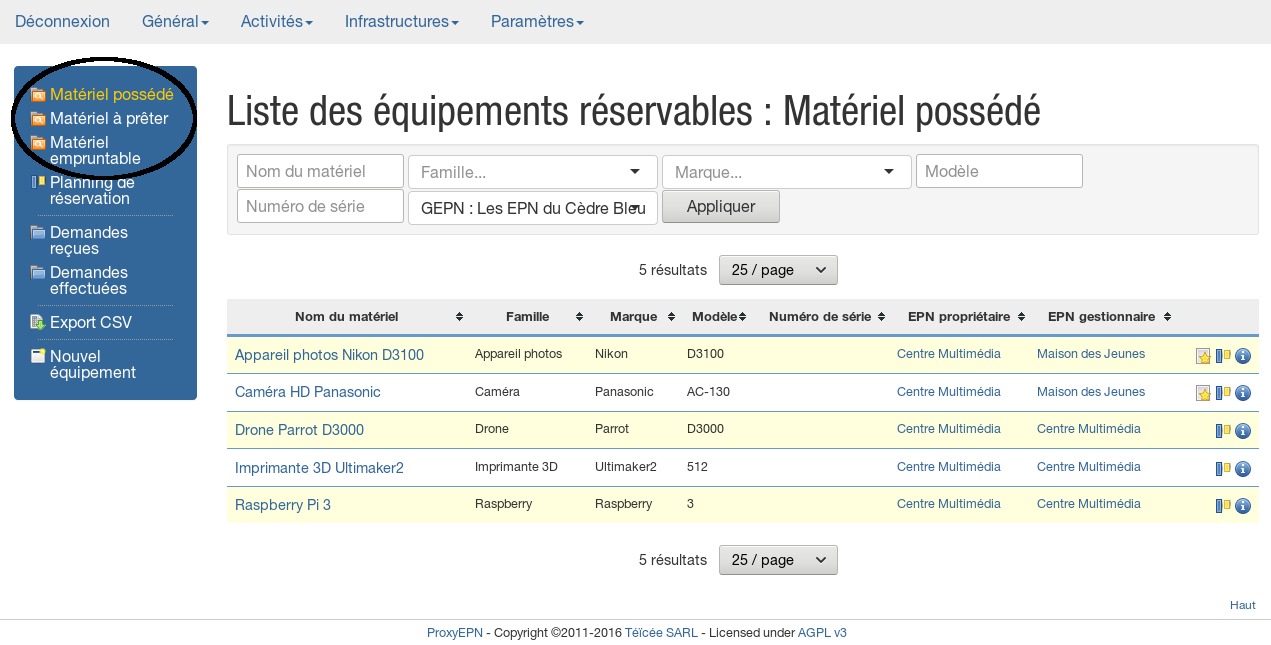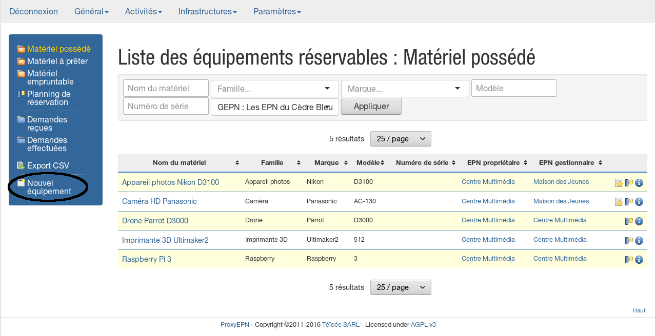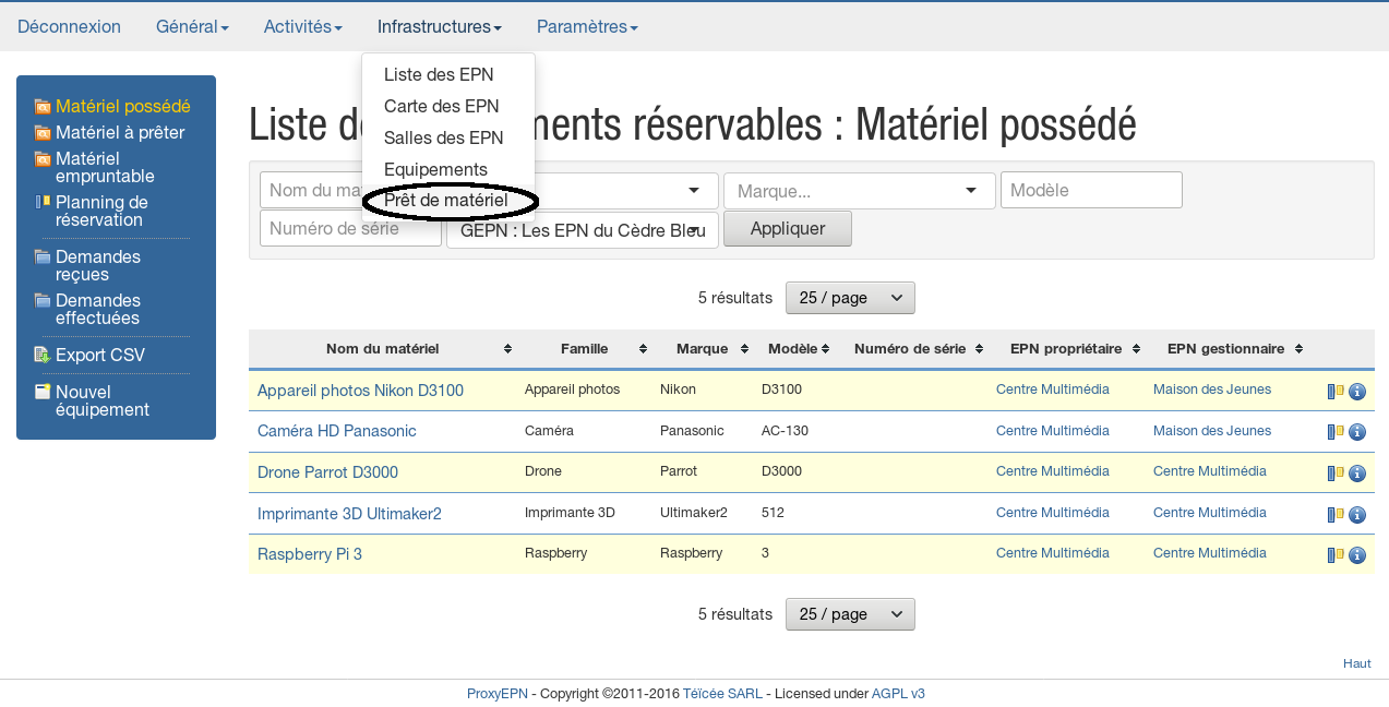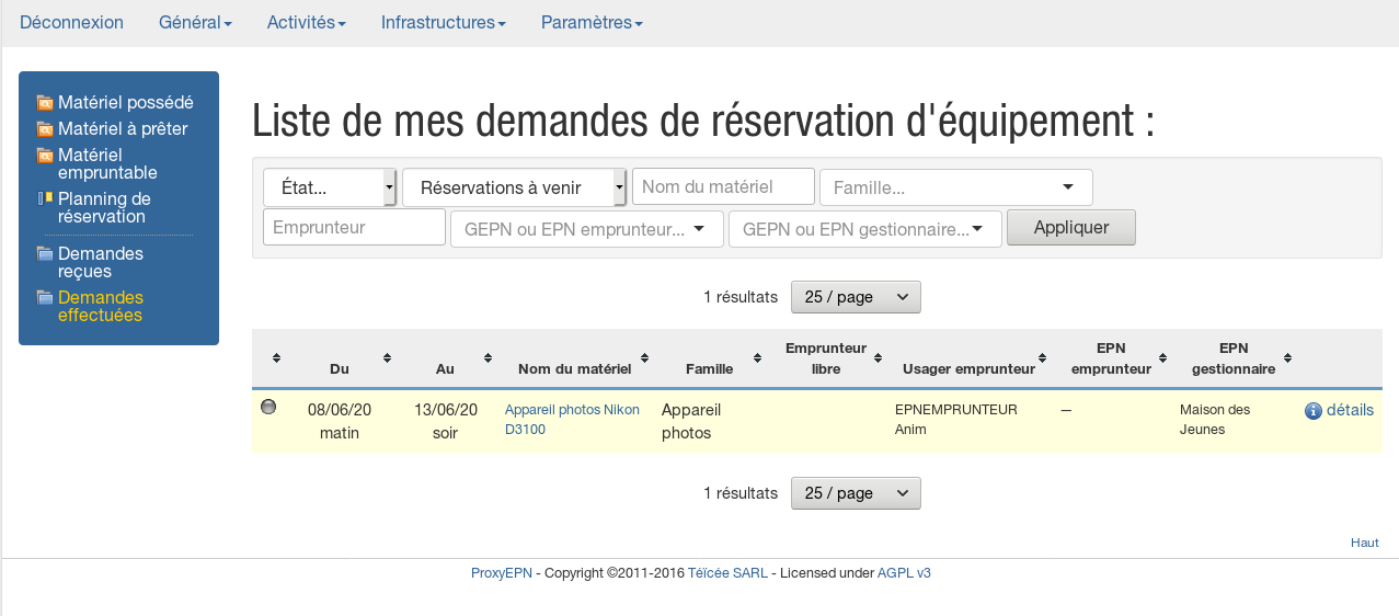EPN gestionnaire ⇒ seul l’EPN gestionnaire peut emprunter le matériel. Par exemple, l’EPN du Cèdre Bleu, gestionnaire de l’appareil photos Nikon D3100, peut emprunter cet équipement pour animer une session photos. On peut comparer ce périmètre d’emprunt à des réservations internes.
