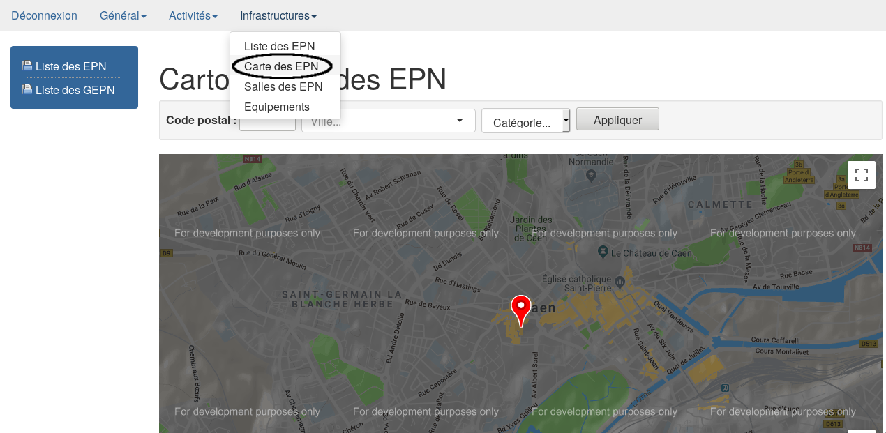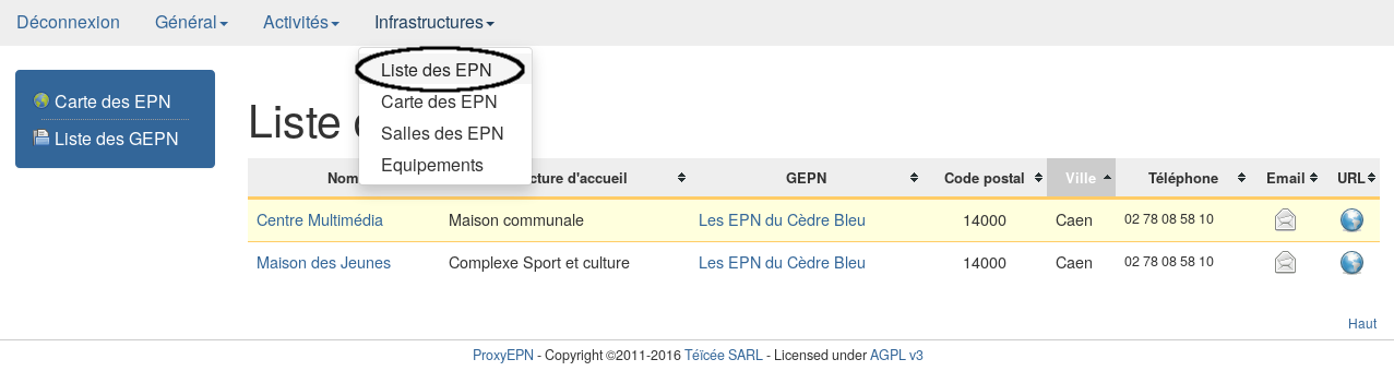 via l’onglet Infrastructures → Liste des EPN.