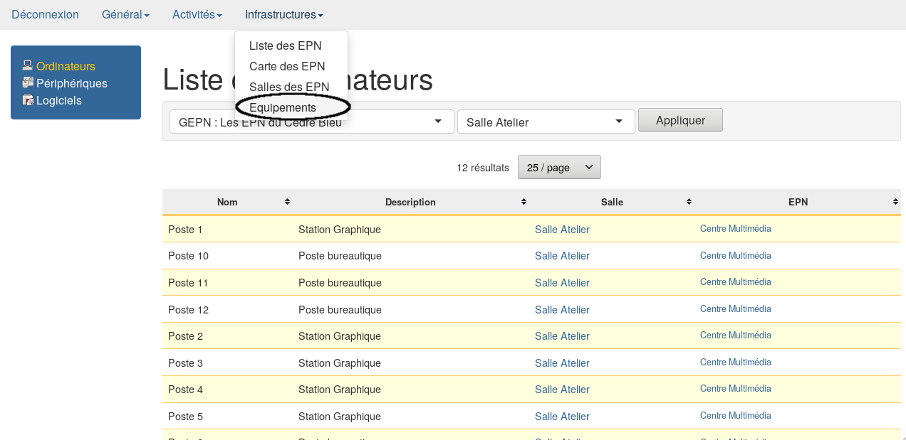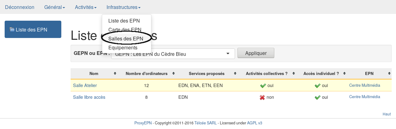 aller dans l’onglet Infrastructures → salles des EPN.