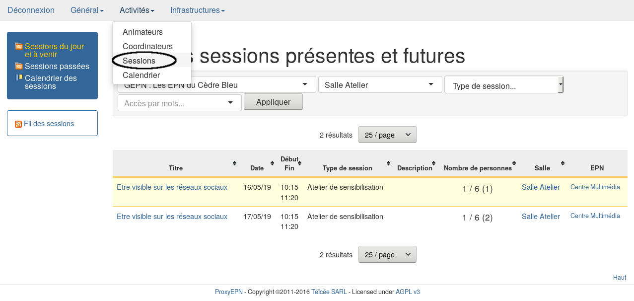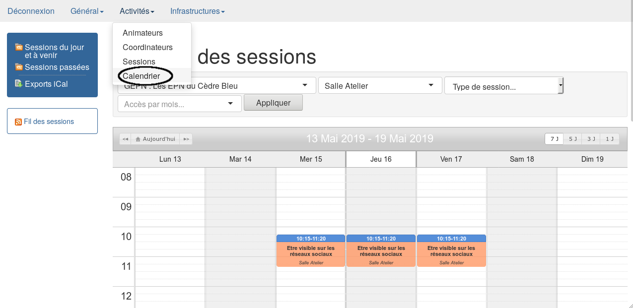 via l’onglet Activités → Sessions, puis en sélectionnant « Sessions du jour et à venir » ou « Sessions passées » dans le menu de gauche.