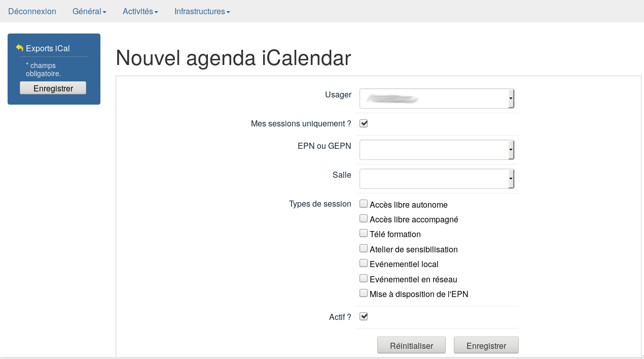 Par défaut, cet export est considéré comme étant actif, mais vous pouvez le désactiver en décochant la case « Actif ? ». Ainsi, votre export sera enregistré et apparaîtra dans votre liste d’exports sauvegardés, mais ne sera pas exporté dans votre agenda en ligne.