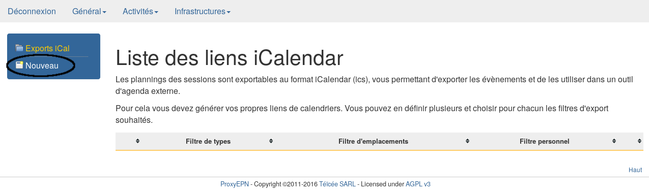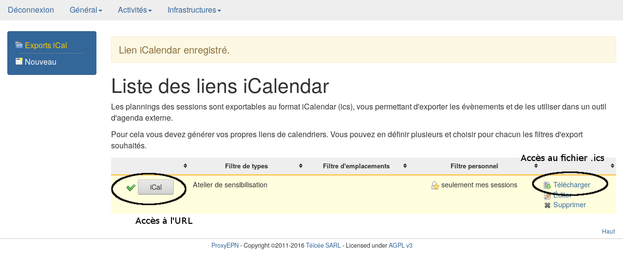 Vous pouvez effectuer un export du calendrier des activités vers votre propre agenda en ligne, en cliquant sur le lien « Exports iCal » dans le menu de gauche.