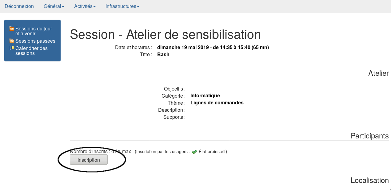Pour se faire, cliquez sur la session à laquelle vous souhaitez vous inscrire, puis sur le bouton « Inscription ».