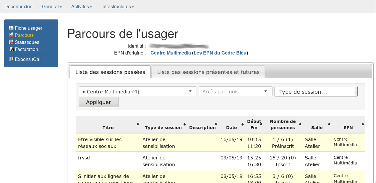 des statistiques liées à votre activité au sein de l’EPN (lien « Statistiques ») ;