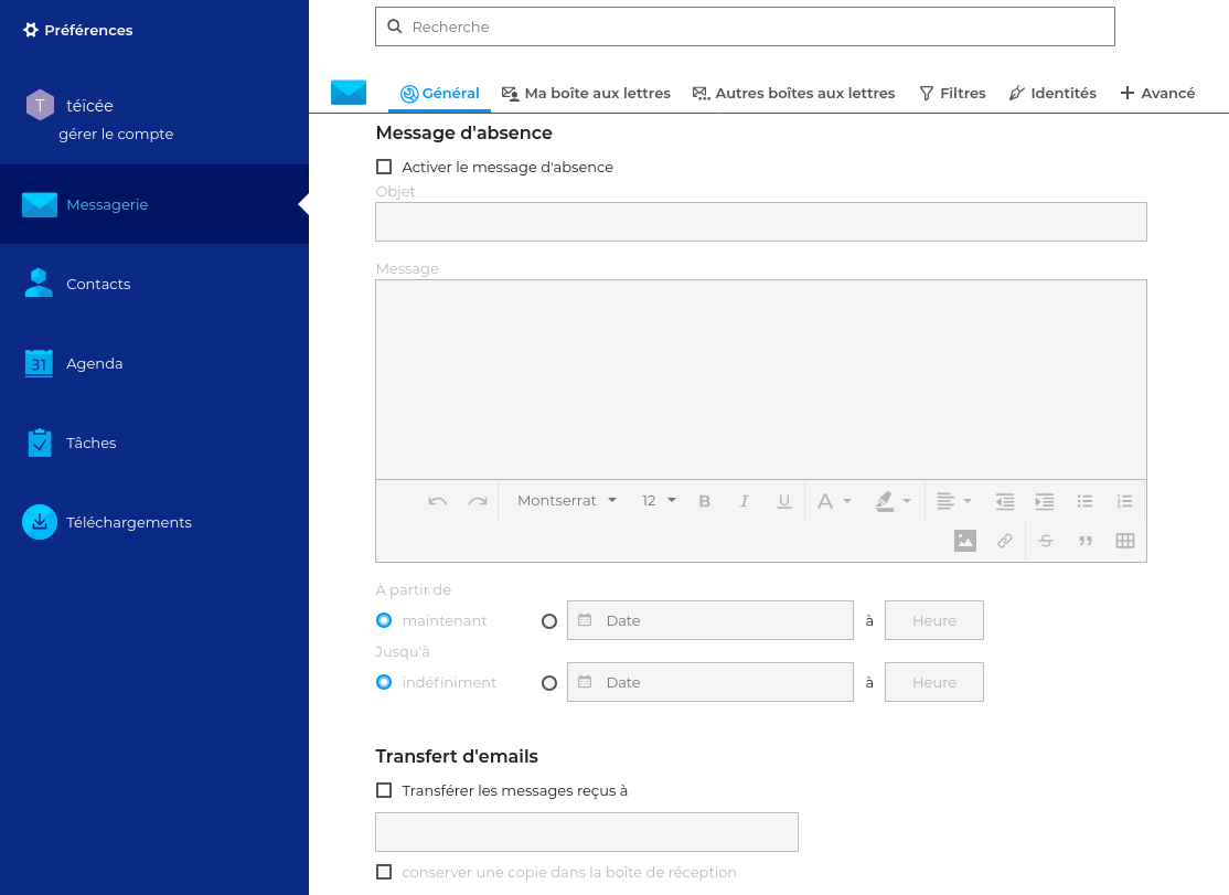 Accessible via l’onglet Messagerie > Général puis descendre jusqu’au formulaire Message d’absence.