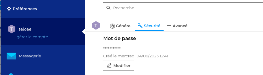 Accessible via l’onglet Messagerie > Sécurité, cliquez sur Modifier puis saisissez l’ancien et le nouveau mot de passe.